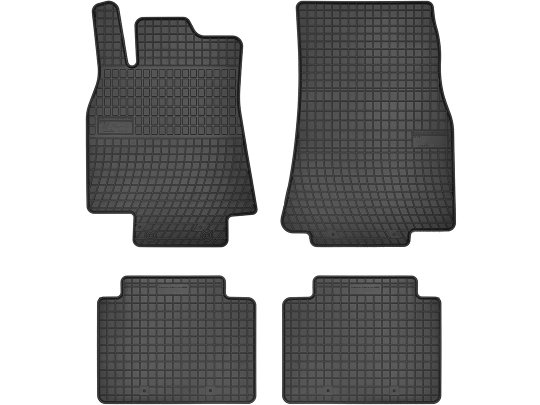 Dywaniki gumowe wykonane są z czarnej, wysokogatunkowej i bezzapachowej gumy o podwyższonej odporności na ścieranie. Posiadają estetyczny rant oraz gęstą kratkę, które zapobiegają przedostawaniu się zabrudzeń na tapicerkę samochodu.