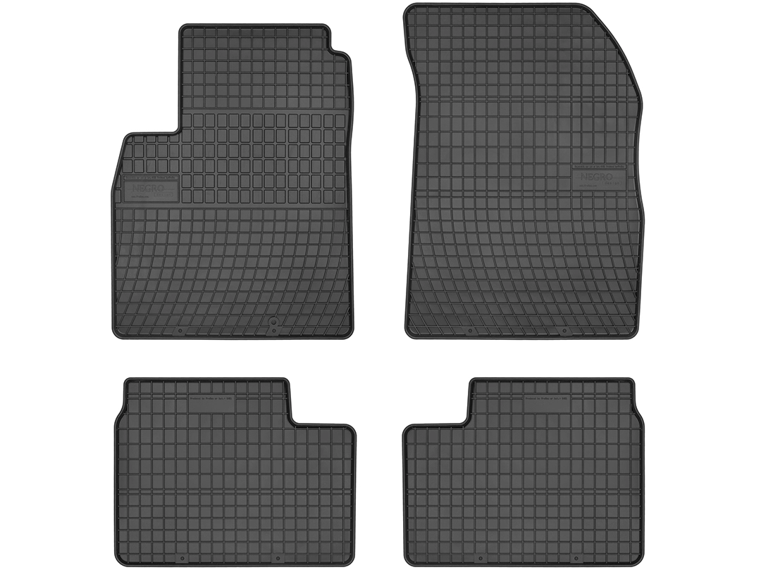Dywaniki gumowe wykonane są z czarnej, wysokogatunkowej i bezzapachowej gumy o podwyższonej odporności na ścieranie. Posiadają estetyczny rant oraz gęstą kratkę, które zapobiegają przedostawaniu się zabrudzeń na tapicerkę samochodu.